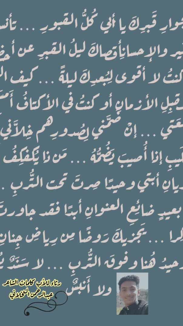بجـوارِ قَبــرِكَ يـا أبـي كُلُّ القبورِ … تأنست بالخــير والإحـسانِ أقصـاكَ لـيلُ القبرِ عن أحـضاني إنْ كـنتُ لا أقـوى لِبُعـدِكَ ليـــلةً … كيف السبـيلُ لِمُقـبِلِ الأزمـــــانِ أو كـنتُ في الأكتافُ أَمـسَحُ دمعَتي … إنْ ضَمَّني لِصُـدورِهم خِـــلاَّني مَـن لِلقُـلَيبِ إذا أُصـيبَ يَضُــمُّهُ … مَــن ذا يُكـفكِـفُ أَدمُـعَ الشـــريانِ أبتي وحــيدًا صِـرتَ تحت التُّربِ … في قـبرٍ بـعيدٍ ضـائِعِ الـعنـــوانِ أبــدًا فـقد جاورتَ رَبـًّا شاكِرا … يَجـزيكَ رَوضًـا مِن رِياضِ جِــنانِ وأنـا الـوحيدُ هُـنا وفوقَ التُّربِ … لا سَـنَدٌ يُعـينُ ولا أَنبــــسٌ دانِ رُحماك ربِّي لـيس غـيرُك عاضِدي … في مِحنتي بِمهامِهِ الأحـزانِ رَحَـلَ الـذي يَبـكي بِلا دَمـعٍ إذا سَمِعَ … الأنيـنَ يجـولُ في وجــداني رَحَلَ الذي يَفـدي يُضَحِّي يَرتمي … في النارِ إنْ وَجَعُ الـدنا أضـناني رَحَلَ الذي لا يَغـمَضُ الجفنً الكَليــلُ … لـه إذا دَمَعَت أَسًى أجــفاني رَحَــلَ الـذي كـانت له الدنيـا … بلا خَيــرٍ حطـــامٌ زَائِـلٌ مُتَـفـــــانِ لم يمَـضِ يــومٌ فـي حياتِـه دون … مَعـــروفٍ لـه يُـوليه للإنــسانِ وكأنـما الـمعروفُ عـندكَ سادسُ … الصـلواتِ أو رُكنٌ مِن الأركــانِ